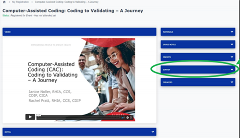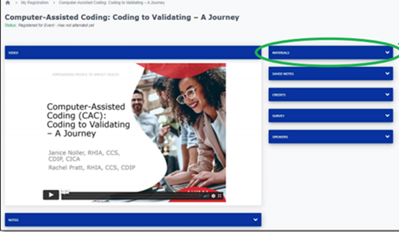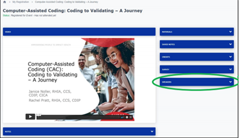 - Get to know the presenters! Access the speaker information by selecting the “Speakers” dropdown widget.