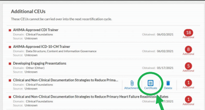 - Hover your mouse over the earned CEU count for that event and select the link to “Certificate.”