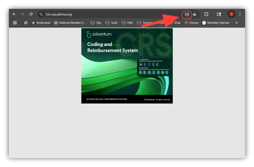 Make sure your pop-up blocker is not blocking the Solventum CRS application screen from appearing; the blocker message may appear near the top or bottom of your screen, or as a small icon on your browser bar (such as in the following screenshot), depending on the system you’re using.