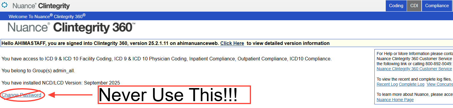 In only the Nuance Clintegrity™ application, it is possible for any user logged into your school’s shared account to change the password, using the Change Password link on the home page. Unfortunately, there is no way around that functionality, it is a product of the application that Nuance can’t change without changing how the application would work for every customer who uses it around the world. Faculty and students are asked to please NEVER change the password. Otherwise other students at their school will be unable to log in.
