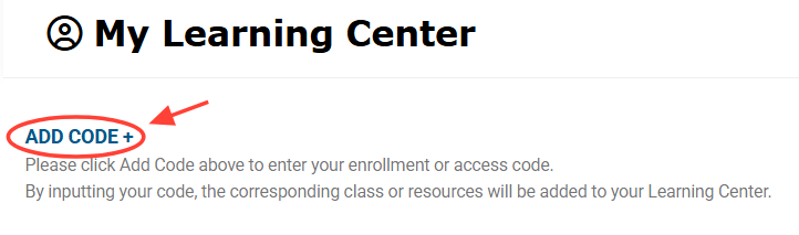 - On the Learning Center page click the “ADD CODE +” button, which will open a new page asking for you to please input the enrollment code you received from your instructor or bookstore: