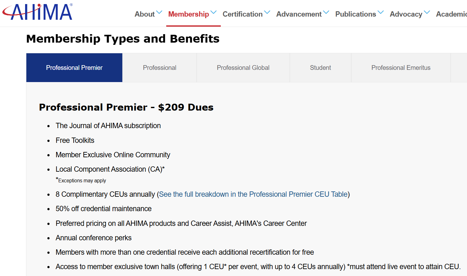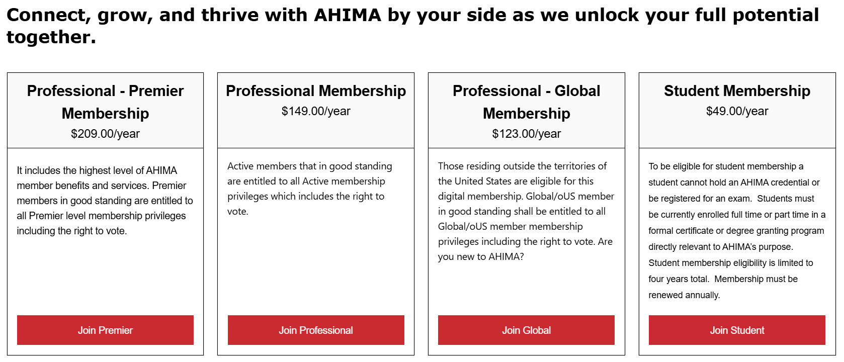 - You’ll be directed to the AHIMA Store/Membership Center where you can select a membership and complete your application to become a member.