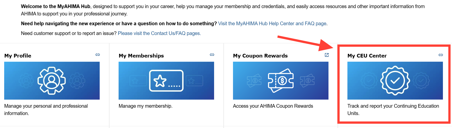 - Log into the My AHIMA Hub and navigate to the “My CEU Center”