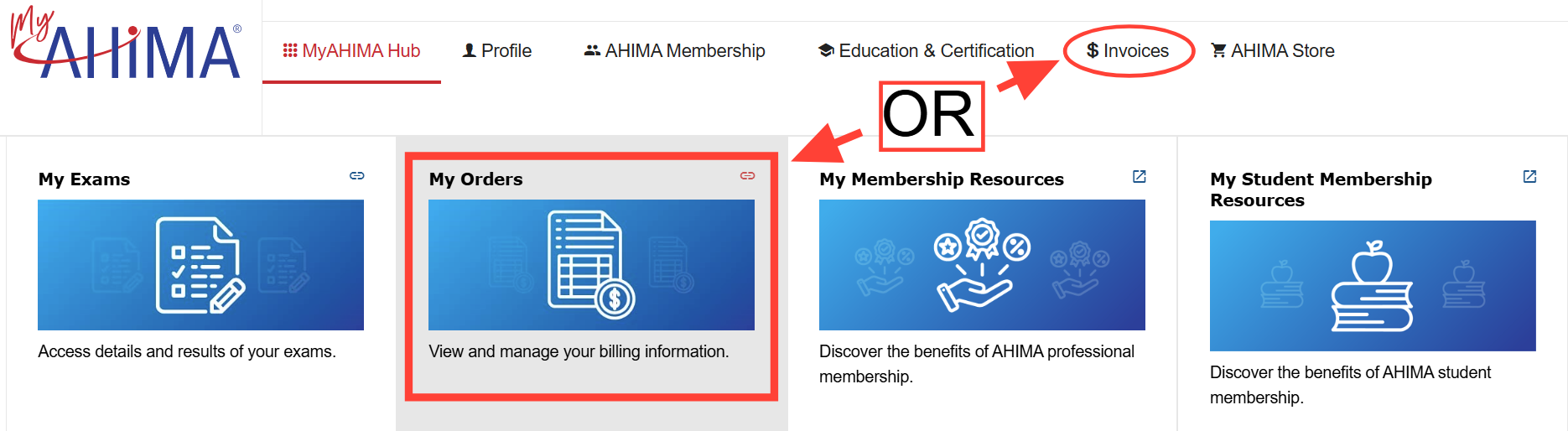 - From the MyAHIMA Hub homepage, click on “Invoices” in the menu bar or the “My Orders” link/card on the page