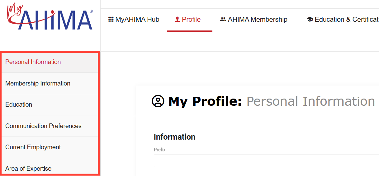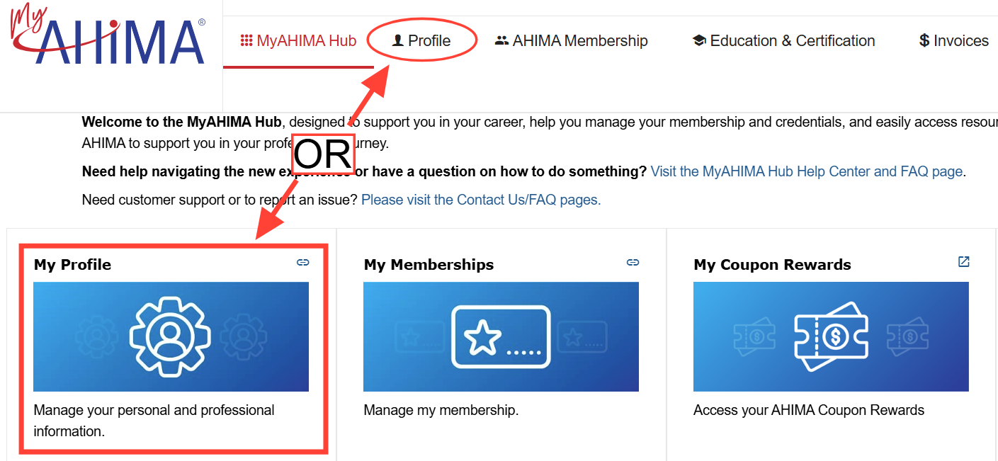 - Go to the Profile tab or navigate to the MyAHIMA Hub, where you will see the My Profile tile