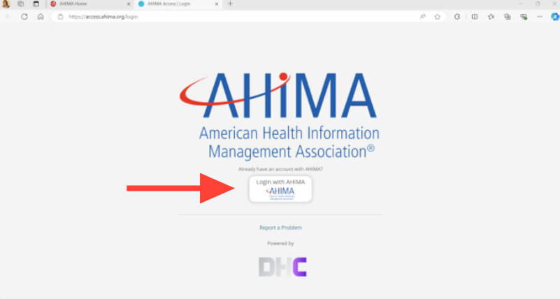 - From there, a new tab will open. Click on the “Login with AHIMA” button in the center of your screen: