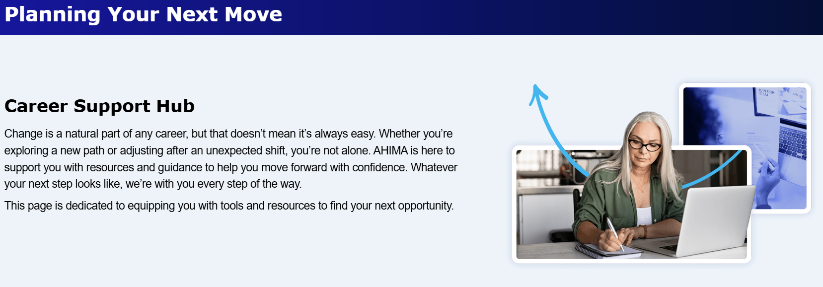 AHIMA is here to support you with resources and guidance to help you move forward with confidence. Please visit our Career Support Hub for tools and resources to find your next opportunity.
