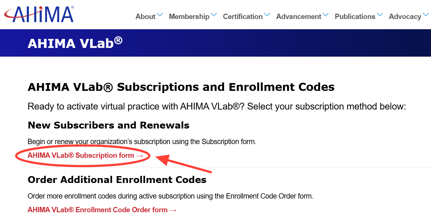 You can renew your school's VLab subscription by completing the VLab Subscription Form located here: https://ahima.org/academics/ahima-vlab/ahima-vlab-subscriptions-and-enrollment-codes/